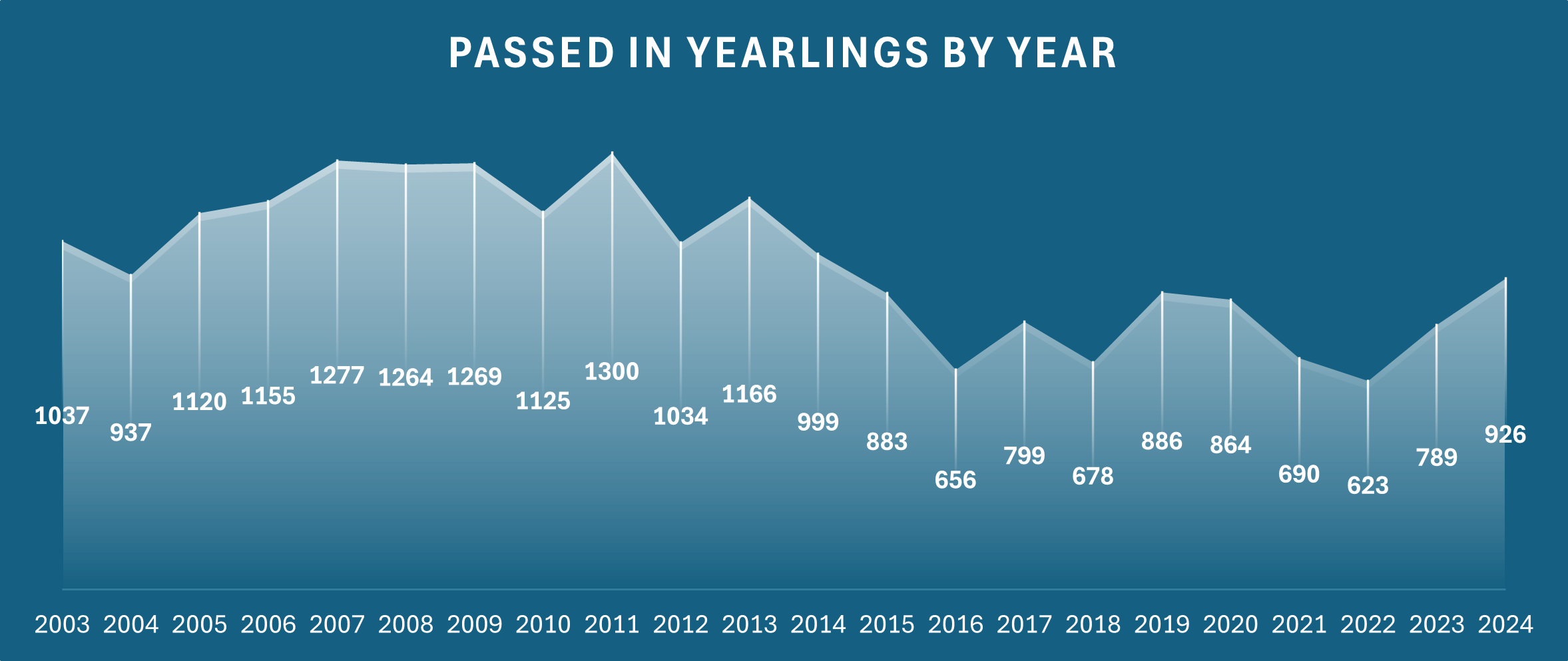 Across the 11 major Australian yearling sales in 2024, it is notable that 926 lots were passed in. That number is the highest of any Australian sales season since 2014, and a 48.6 per cent jump in the space of just two years. A historically low number of 623 yearlings were passed in during a record-breaking 2022 season.